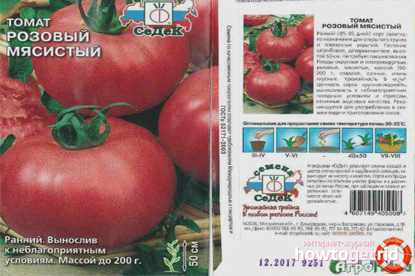 "Fleischiges Rosa" bezieht sich auf früh reifende Tomatensorten. Die erste Ernte kann nach 3-3,5 Monaten ab dem Zeitpunkt der Samenkeimung geerntet werden. Das unterentwickelte Wurzelsystem begrenzt das Wachstum der Büsche, so dass der mittlere Busch eine Höhe von bis zu einem halben Meter hat. Pflanzen unterliegen keiner Dehnung, daher haben sie einen ausreichend starken Stiel, der unter dem Gewicht der Frucht nicht bricht.