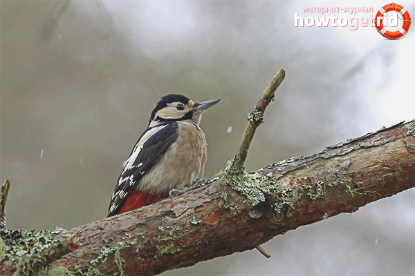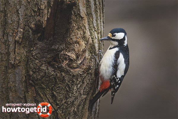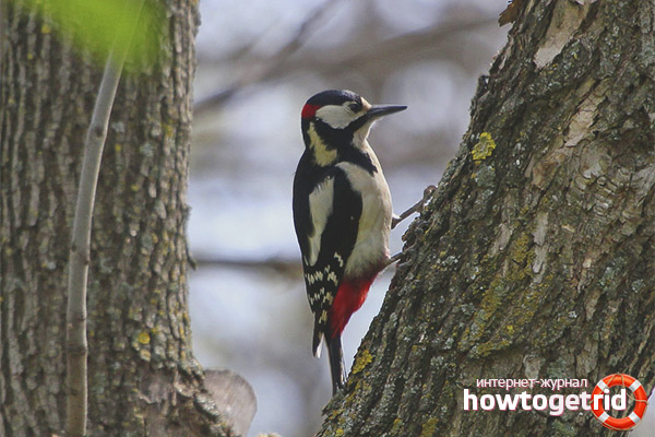 - But we will not recede from the main thing. Woodpeckers thus obtain food. When they knock on the bark, various insects crawl out of the cracks. This bird grabs them and eats accordingly. Some smarter individuals know where to knock in order to get food directly from the bark. The basis of the diet in the summer is small caterpillars, beetles.