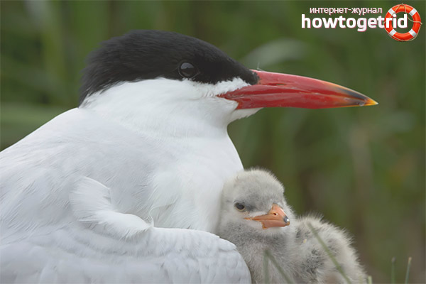 This species of terns, like tegrava, is the largest of the family of these birds, only slightly inferior in size to a silver gull. Chegrava differs from this species of birds with a characteristic hat that has a rich dark color, of the same color with its paws, a bright red beak and a tail ending in a neckline.