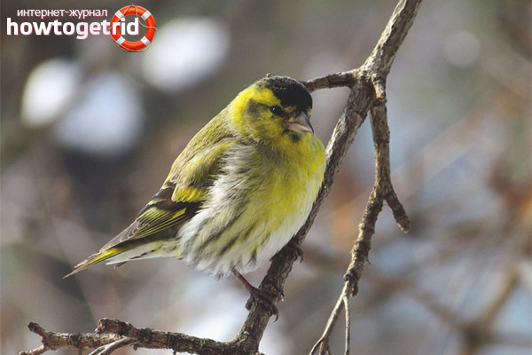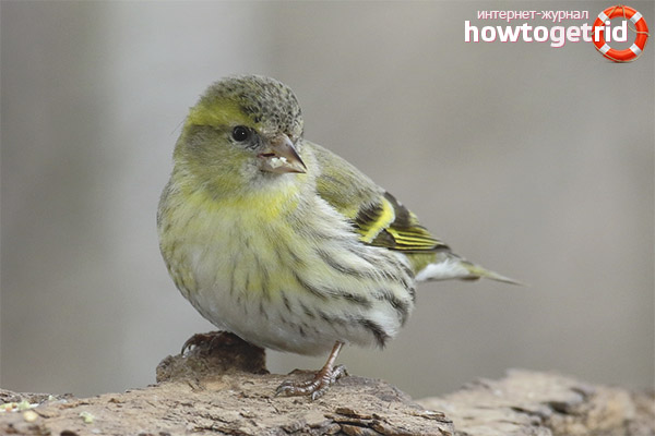 Feeding squirrels is quite simple. They are, in principle, not particularly picky about food. Like most birds that feed on cereals, they will need to provide plenty of clean drinking water. Their diet can be absolutely any mixture of grains and seeds of trees. Moreover, it is possible to supplement the menu of siskins with fruits and vegetables. They happily eat apple, cabbage and carrots.