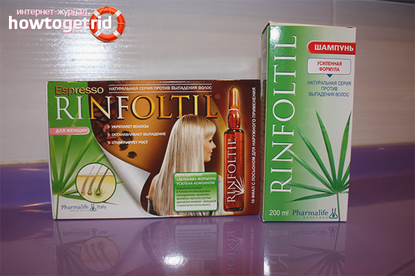 - Rinfoltil is dispensed in ampoules and pills, hence the price range. The composition includes mint, nasturtium, ginseng, palm fruits (dwarf), biloba, camellia.