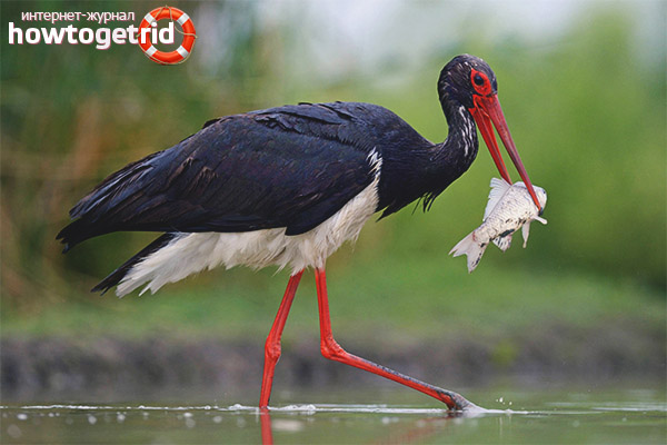 Storks prefer food of animal origin, although they do not differ in particular legibility in food. They feed mainly on fish and animals living in the water. But during flights and drying out of reservoirs in extreme heat, when there are few fish and amphibians, you have to eat other foods. For example: