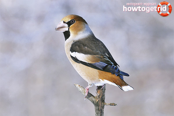 Usually the birds feed on the seeds of berries. So, the most favorite feast of birds is cherry pits. Their oak tree easily splits with its large beak. In addition, the bird eats shoots and buds of young trees in spring, as well as insects, which are found in abundance in the bark and foliage in summer.