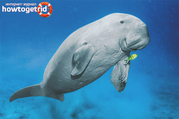 Outwardly, the dugong would be easily confused with manatee, if not for the rear fin, which, unlike the manatee, is separated by a deep notch in the middle, and most of all resembles a whale. For comparison, the back fin of manatee in shape is a kind of oar or paddle similar to the fin of manatee, as you like.