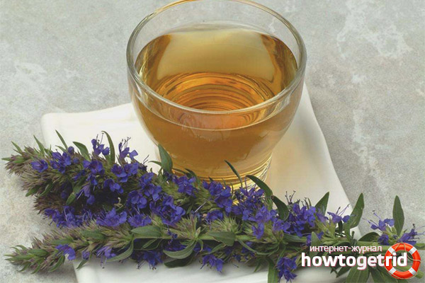 - Hyssop herb decoction (with menopause). It was noted that when using a decoction from the collection of herbs, climacteric symptoms are more easily tolerated. The recipe is as follows: 1 tbsp. a spoonful of the workpiece is poured with two glasses of boiling water, shaken and infused for an hour. Having filtered, the broth is consumed in a heated form twice a day in half a glass.