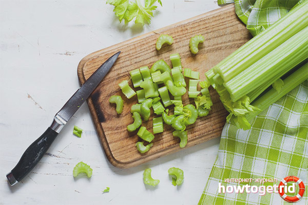 Celery can be divided into three components, which are eaten in different ways. Fresh herbs with a harsh ethereal aroma are added to salads and sauces, as well as meat and vegetable dishes. To do this, it is enough to rinse the greens under water, select the wilted and yellowed leaves - and send to the dish whole or finely chopped.