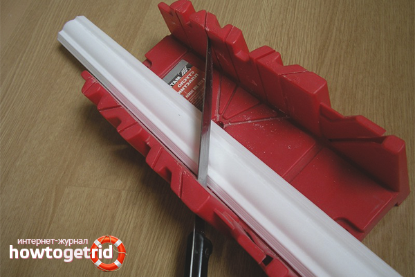 In order not to spoil the material, start making corners on trial pieces. Be sure to consider that the angles are external and internal, so the cropping methods are different in design. The grooves on the walls of the miter box will show the direction in which the hacksaw blade should be inserted. The fillet bar is always located, just like on the wall.