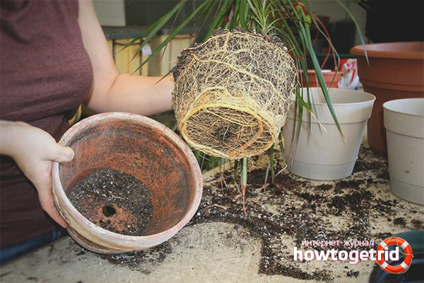 The pot is turned over, knocked on the bottom with your fingers or a wooden stick. They grasp the dracaena stalk closer to the base and try to crank the container around the axis. If it lends itself easily, then the flowerpot is removed, and the flower, along with an earthen lump, is placed on a paper or fabric napkin.