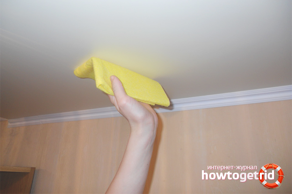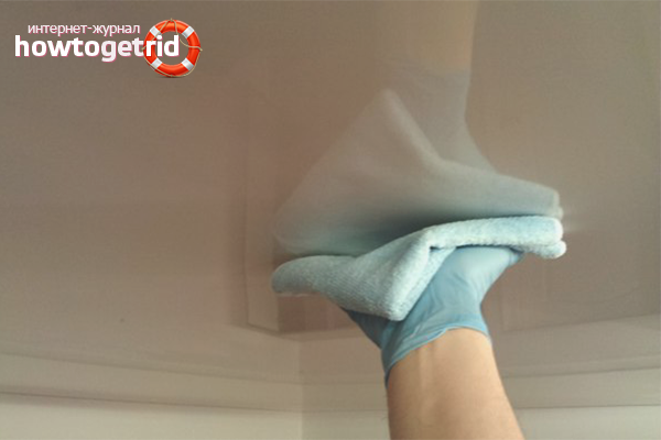To restore the product shine, you need to saturate the sponge with a substance that is used to clean the windows or ammonia. Then wipe the ceiling again with a dry cloth.