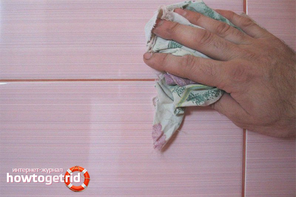 The mastic that has come out of the seams is swept away with a dry rag. Particles of the paste, which managed to dry, are removed from the ceramic surface with a grater. The tool resembles a wide scraper with a rubber nozzle in shape.