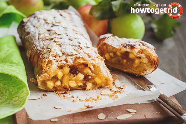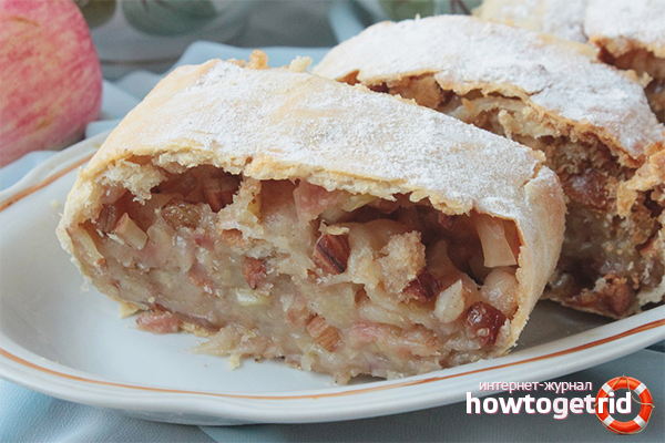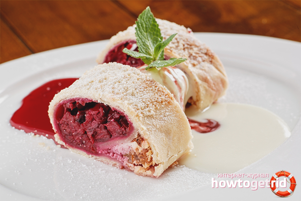Many housewives, having once tried strudel, want to cook it on their own. Traditionally, dessert is made with apples, raisins, cinnamon, walnuts, almonds, jam. However, cherries, pears, seasonal berries and even meat can be filled. Bake the dish according to your family’s personal preferences.