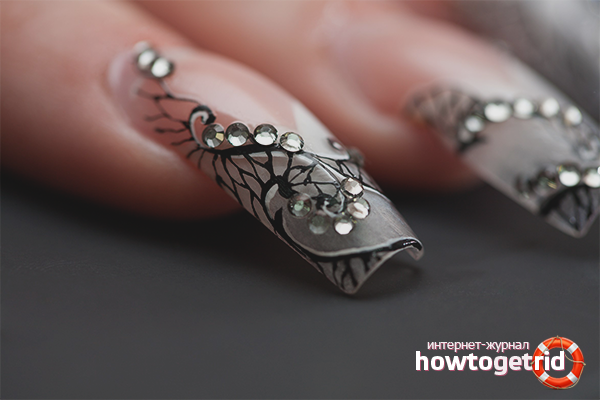 Before using the pebbles directly, prepare the nails: file and polish them, remove the cuticle. Fix rhinestones on varnish or special glue, pick them up with a needle / toothpick. Draw a picture with a thin brush to better see the trajectory on which decorative elements will be located.