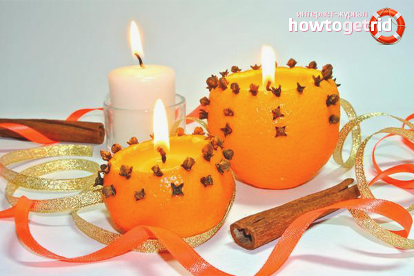 - You can make a natural candle from lemon zest.To do this, cut the lemon in half, carefully cut the pulp. When melting in the gel, add cloves, lavender essential oil and a sprig of rosemary. The melted gel must be poured into a mold and allowed to cool. It will turn out a beautiful and fragrant fruit candle.