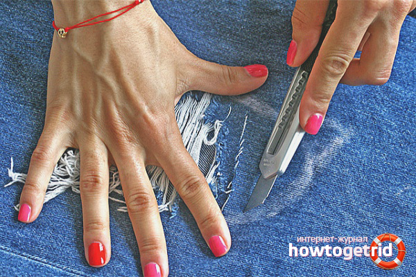 - After you have decided on the length and location of the lines, you can safely proceed to cutting. If you need to make even edges, cut jeans with scissors, after making a small hole with a blade.