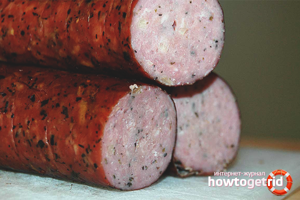 Add salt, pepper, natural dyes and seasonings to taste to mince. The next question is what to cook the sausage and what to wrap it in. It is not recommended to wrap the sausage in the film before smoking, because such packaging may be damaged. It is best to use a natural product - the gut. Today it’s not necessary to mess with the guts purchased from the butcher. The shops have special guts, peeled and pickled in saline. They are filled with cooked minced meat very tightly, because after cooking the contents of the sausage are reduced in size. After that, the ends of the sausage should be tied with ropes, make several holes on the sausage (so that it does not burst) and send to the smoke-cured smokehouse. Smoke sausage is better on alder sawdust. Usually, sausage needs to be smoked for about two hours, after which it becomes completely usable. But some housewives, doubting the quality of the heat treatment, after smoking, cook the sausage in the water for some time.