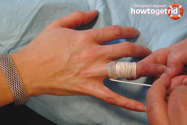 Your actions: take a thread (preferably silk or dental), pull one end through the ring, the other wrap around your finger until the bending joint. Pull the end of the thread that was threaded under the ring; in the direction of the thread, the ring should slowly and smoothly move forward towards the end of the finger.