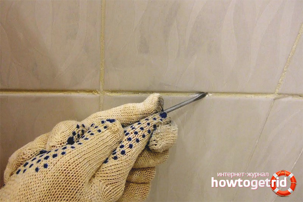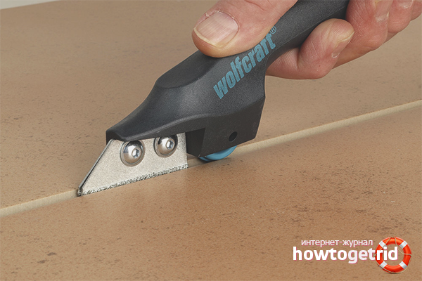 The edges of the ceramic tiles are sealed with masking tape. Take a paper knife or tile binder. Another tool with a thin sharp blade will do. The tip of the knife is carried out in the center of the seam. They try to drive the tool as deep as possible so that it reaches the concrete base.