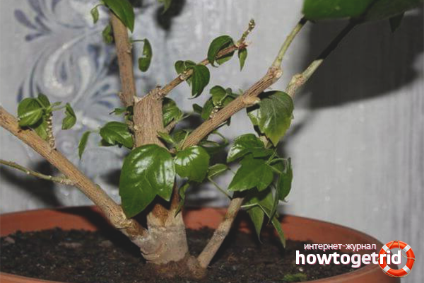 Pruning can be done in March so that a Chinese rose blooms in spring. If you need to delay the formation of buds, the removal of healthy shoots is postponed until May. Cut not only green, but also dry branches, on which there are no leaves. The diseased parts of the ornamental bush are also removed to stop infection.