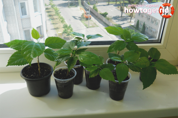 Hatching seeds are planted in a box with a substrate for hibiscus and covered with glass. The transparent cover is removed when 2-3 full leaves are formed on the seedlings. The grown Chinese roses dive and transplant into separate pots.