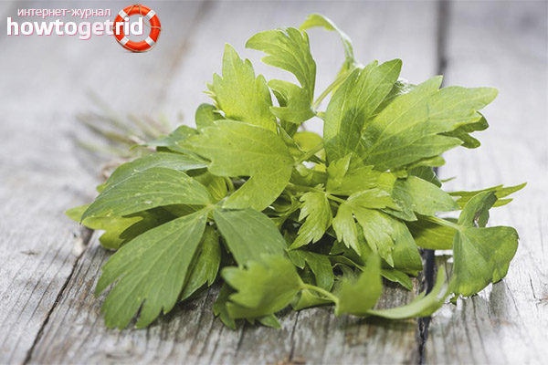 Lovage is used in dietary nutrition along with dill and basil. It is used for salads and marinades, minced meat, in the form of a spicy mixture, adding onions and parsley. As a sauce, a lovage is served at the table with meat and soups, vegetables and dishes of rice, poultry, cereals and fish. It should be added to the first dish lovage, as the taste of meat is significantly enhanced.