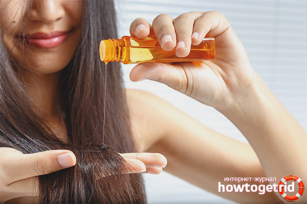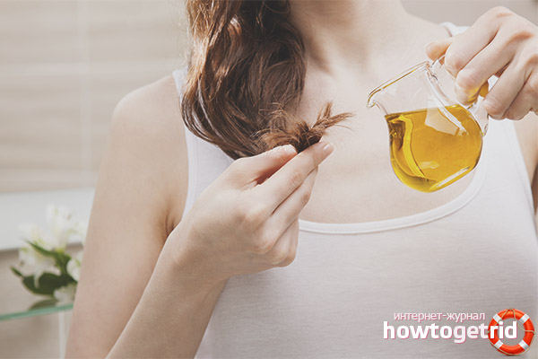 To do this, you need only about 50 ml of oil - how much will take on your hair length. The product must be heated in a water bath to body temperature, applied to dry locks and wrapped with a film or bag. Oil is kept for 30-40 minutes, in some cases - an hour. To increase efficiency, you can use a hairdryer in warm mode, directing a stream of air over the bag to maintain temperature or simply wrap your head in a bath towel.
