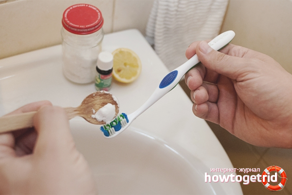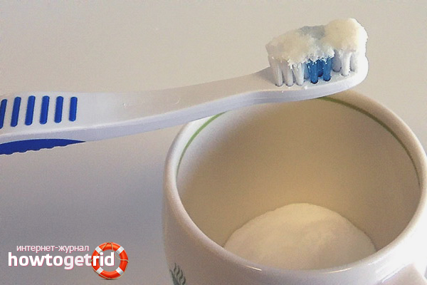 - Soda breaks down the dirt quite quickly, just a few minutes after the start of cleaning, the smile begins to shine.