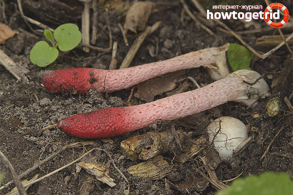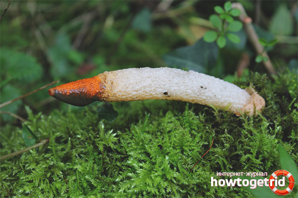 Then, as the upper cover, called the peridium, grows, it breaks into several pieces. Usually two or three. These parts fall to the base of the receptacles. A recipe is a leg-shaped formation of light yellow or dim orange. It is about 10-12 centimeters long, and its diameter is one centimeter. The receptacle ends with a sharp peak, on which there is no hat. Inside it is hollow, its walls are composed of spongy matter. The top is covered with gleb - this is a slime of dark olive color, which contains the spores of the fungus.