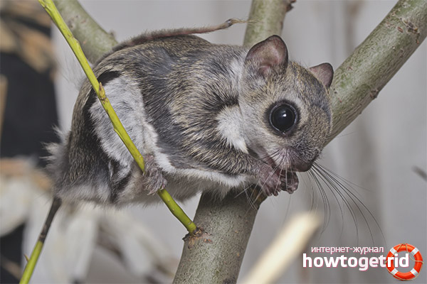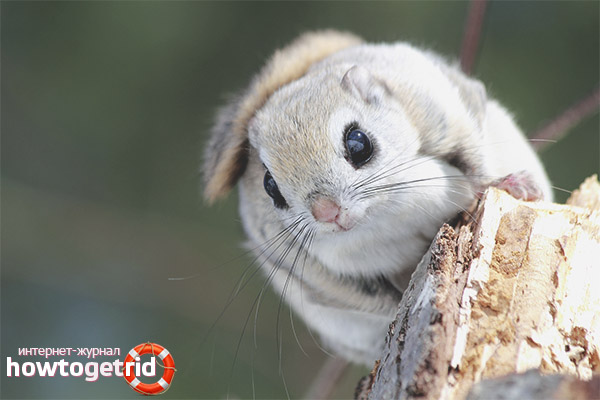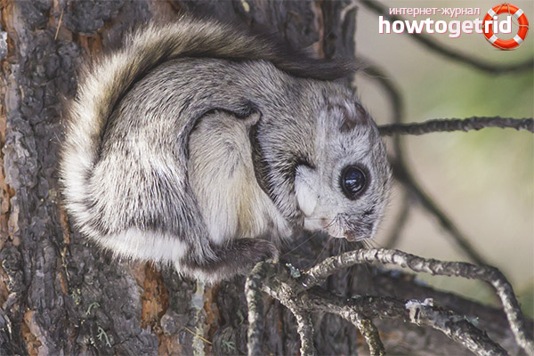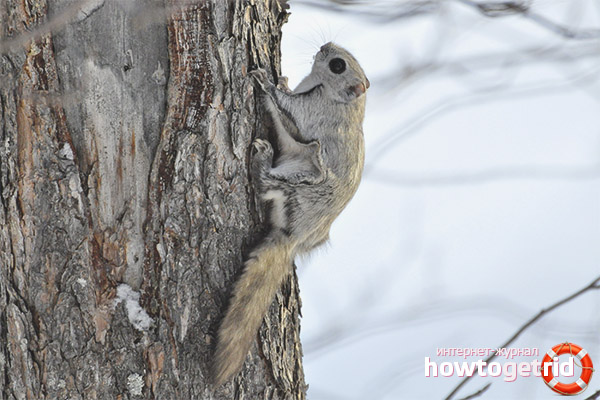 The main occupation of flying squirrels is the search for food. Mostly its subsistence consists of various plants and tree buds. Earrings of birch and alder are a favorite delicacy of this animal. She even makes stocks of them for the winter, hiding earrings inside her nest. In summer, flying squirrels include mushrooms and berries, as well as young shoots.