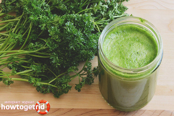 - Parsley decoction. 2 tbsp chopped greens pour 250 ml of warm water and boil for 15 minutes. Broth is drunk for intensive healing in a three-day course, 1 glass a day with meals.