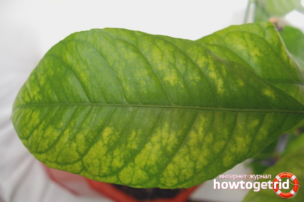 Signs Yellowness manifests itself in the form of spots between the veins. The veins themselves remain green. If the situation is not changed, then the lemon will die from exhaustion.