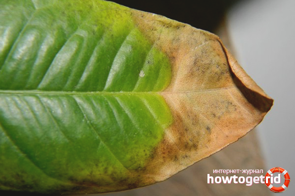 Signs First, the tips of the leaves turn yellow, then dry. Further, yellowness extends to the entire sheet plate, it turns pale, dries and falls off.