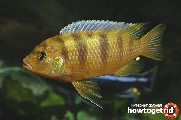 The male of this species has an orange color. On his back there are dim dark streaks. The female is painted in a bright shade of blue. The stripes on the back are more pronounced. This feature distinguishes representatives of the species from other mbuna fish, in which males are blue and females are colored in orange.