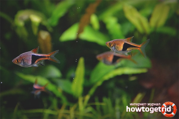 Aquarium fish rassbori completely unpretentious and able to adapt to any conditions. They live in a small aquarium. A tank of about 40 liters is enough for a flock.