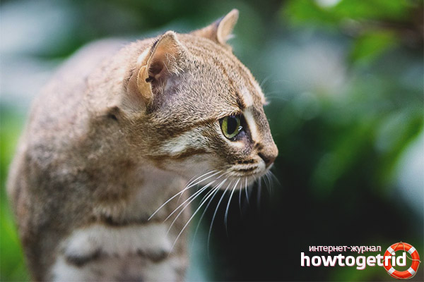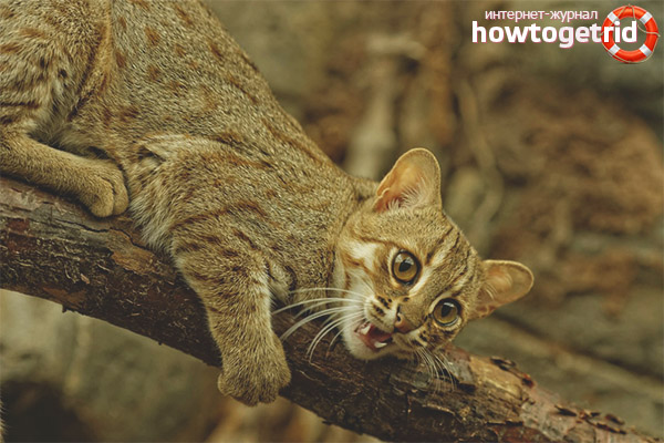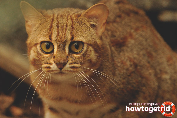 Among the cat family, the appearance of a rusty cat is distinguished by the most pronounced miniature. The animal is characterized by obvious elusiveness, which makes it stand out among other members of the cat family. The predator is covered with motley hair, in connection with which it is given another name that sounds like a spotted-red cat.