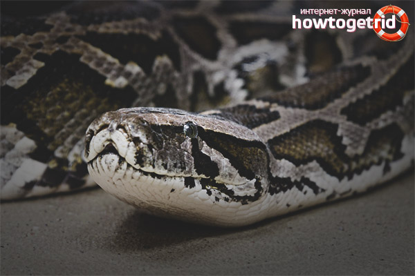 The body of the snake is brown in color with a predominance of light colors. On the body there are white stripes that are unevenly scattered across the surface. The snake has an elongated head shape. She is a bit flattened. Wallets, boots, belts are made from the skin of the Indian python. Some people believe that such pythons have healing properties and kill them for the production of drugs.