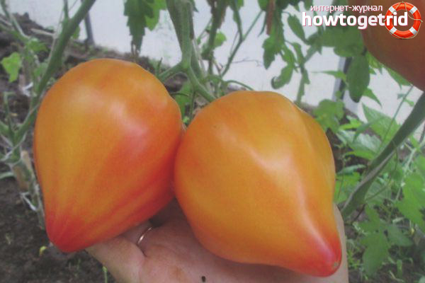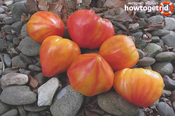- Coloring. The skin of tomatoes during ripening acquires a red color with orange blotches. The ends of the tomatoes have a bright raspberry color. In addition, the inside of the fruit also has a heterogeneous color. In the depths of the pulp of an orange hue, reddish veins can be seen.
