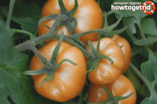 The hybrid is well tolerated by changes in weather conditions. It has a high yield. The first crop ripens in mid-summer. Fruits appear 104 to 107 days after seed hatching. Tomato belongs to the determinant variety, has plentiful foliage. The first color brushes are formed above 5 - 6 sheets. Flowers appear in one leaf. The bush grows up to 50 - 60 centimeters up, rather stocky does not require a garter. On each brush 5-7 fruits ripen.