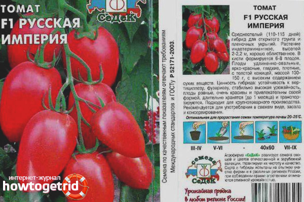 "Russian Empire" refers to an indeterminate type. In height reaches about 2 m. In one brush from 6 to 9 tomatoes can ripen. The average ripening time from the moment of sowing is from 110 to 115 days. Feels good in open ground in the southern regions. In cooler places with unstable weather it is better to use a greenhouse or a greenhouse. It has good immunity, tolerates many diseases.