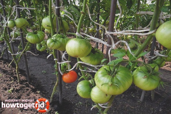Bushes are planted in a permanent place in rows. There should be a distance of 40-50 cm between the seedlings. A metal or wooden crossbar should be installed near each hole, to which plants will be attached as they grow. Lower leaves and stepsons must be cut off in a timely manner.