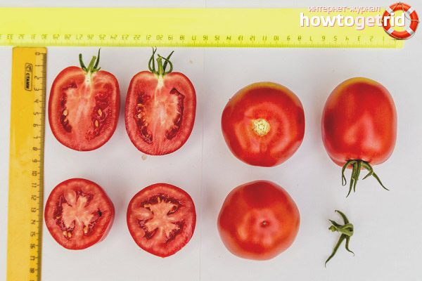 - The characteristic structure of the fruit is considered density, juiciness and elasticity, so tomatoes are suitable not only for salads, but also for canning. The rich red color provides attractiveness to the fetus, both as an independent dish, and as a complement to salads, preservation and various dishes.