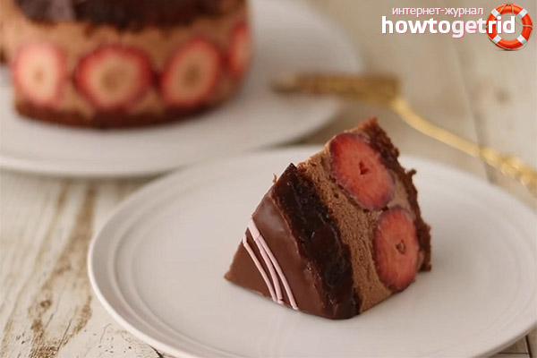 At the final step, we proceed, slowly, to the assembly of our confectionery bliss.We set the bottom cake in the form, put the halves of the berries on the sides, generously pour the strawberries with chocolate mousse (almost to the edge), cover with a second blank, add ganache, distribute it on the surface of the product with a pastry palette and freeze. Then we proceed to the final decoration of the dessert at our discretion (as your imagination allows). At the output we get a bright, velvety, unusually mesmerizing taste and the same cut.