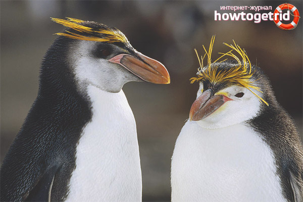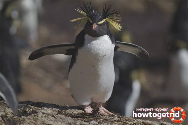 Crested penguins are completely unsuitable for a single lifestyle, they are combined into huge colonies of more than 3 thousand individuals. They like to live not only on the sea coast, but also on rocky ledges, choosing sites near fresh water reservoirs, as they need to drink. On those islands where there is a lot of soil, they even dig minks and nesting niches. They communicate with each other, making loud noises. And during the mating season around the colony stands incessant whine. Despite the good-natured appearance, they are aggressive towards strangers and uninvited visitors. Seeing the intruder, they begin to yell heart-rendingly, bouncing and stomping. At the same time, twitch their shoulders, open their eyebrows, spread their wings and lower their heads menacingly. If a stranger does not want to get out, the defender starts to fight - he hits his head, wields wings, pokes with his beak.