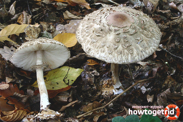The common umbrella fungus differs from its motley relative in more elegant forms. Also, the main difference between these species can be attributed to the very modest sizes of representatives of the species (leg length up to 100 mm, cap diameter not exceeding 150 mm).