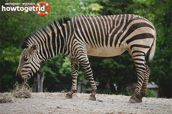 Contrairement à un zèbre plat, le zèbre de montagne n'a pas non plus de «rayures d'ombre» et les rayures ne se rencontrent pas sous l'estomac. Au lieu de cela, il est blanc avec une bande noire centrale. Cependant, les caractéristiques les plus diagnostiques de cette espèce sont le motif "à mailles" de rayures étroites le long de la croupe et d'un lambeau carré de peau, ou sous-poil, qui existe sur la gorge de ce zèbre. Mountain Zebra est un bon grimpeur sur un terrain escarpé et rocheux. Elle a développé des sabots très pointus et rigides. Longueur du corps - jusqu'à 250 cm, longueur de la queue - 40-50 cm, hauteur des épaules - 116-150 cm, poids - 240-372 kg.