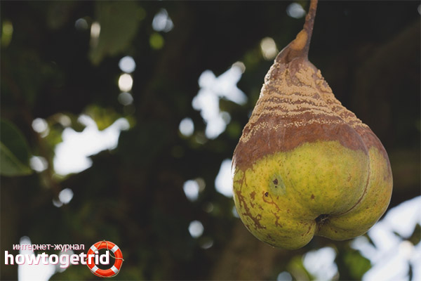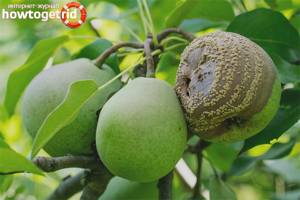 Souvent, vous pouvez trouver un champignon de fruits sous forme de croissances sur les fruits et les feuilles d'une poire, ce qui semble inoffensif. Un enrobage en croûte dense recouvre le fruit, en raison duquel son goût et ses propriétés aromatiques sont considérablement altérés, et la chair grossit. Pour que votre poire ne perde pas de prix, vous devez vous battre avec un tel champignon en pulvérisant: