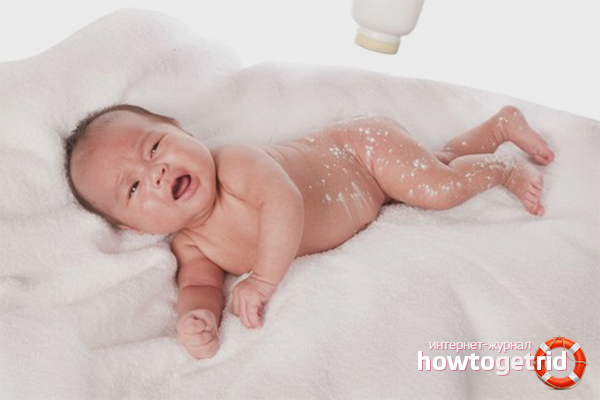 - La poudre doit d'abord être appliquée sur les mains, puis frottez doucement la poudre de talc sur la peau du bébé afin qu'il n'y ait pas de grumeaux. Trop de poudre n'est pas nécessaire. Le talc, qui apparaîtra à la surface de la couche, réduira sa capacité à absorber le liquide. Cela conduit au fait que le bébé sera mouillé. Une fine couche suffit.