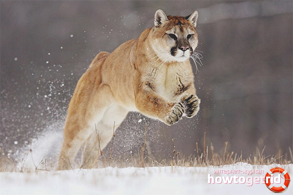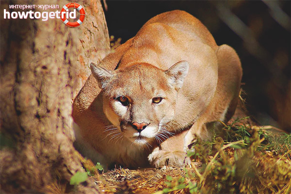 - Il est à noter que les prédateurs chassent principalement au début du crépuscule. Le plus souvent, les couguars sont en embuscade, après quoi, en sautant, ils attaquent la victime. Le chat essaie de saisir immédiatement une bouchée de sa proie en sautant sur le dos.