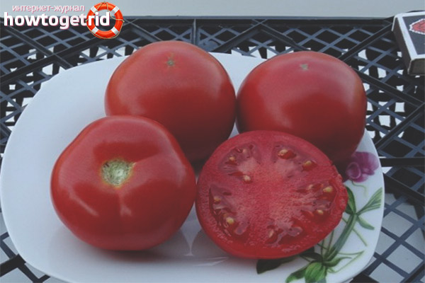 Le fruit est parfaitement lié. Presque chaque fleur se transforme en une grosse tomate mûre. Le pédoncule se flétrit rarement et tombe. La quantité de feuillage est ordinaire; les fruits ont une forme lisse et arrondie de couleur rouge vif. La tomate n'est pas très dense, juteuse à l'intérieur. Il a un goût prononcé avec un goût sucré.